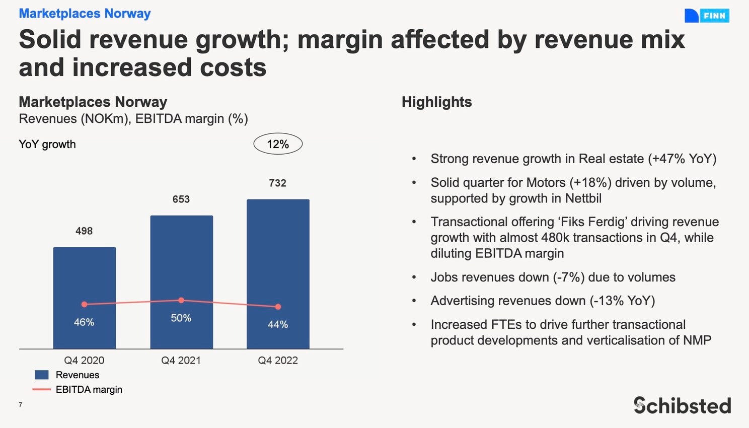 In Norway, Schibsted has reported that the transactional model has been driving revenue growth while diluting the margin, specifically pointing out Product Development investments needed for further growth.