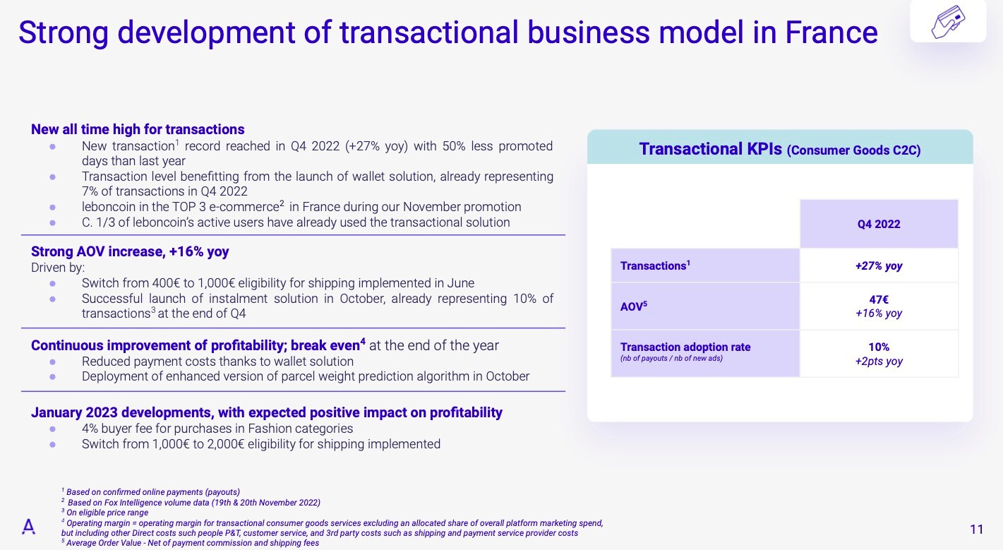 In France, Adevinta similarly reported that the transactional model has been loss-making for leboncoin, but that it did reach a break-even on the unit economics of by the end of 2022. As of January 2023, leboncoin introduced a 4% buyer fee for purchases in Fashion categories and restricted shipment eligibility requirements, further supporting the path to profitability of the transactional model.