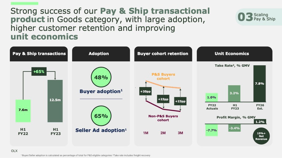 Elsewhere across Europe, Prosus has reported a significant volume of adoption of the Pay and Ship solution by OLX customers, paired with a negative unit economics that is due to turn positive towards FY2026.
