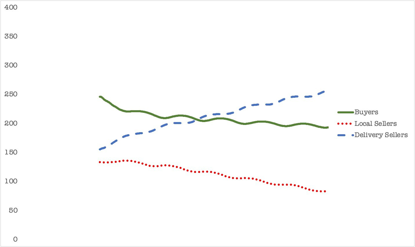When delivery services are offered by businesses who have a longer lifetime than individual local sellers, the share of businesses grows over time, local sellers decline, and the overall marketplace health is also not growing.